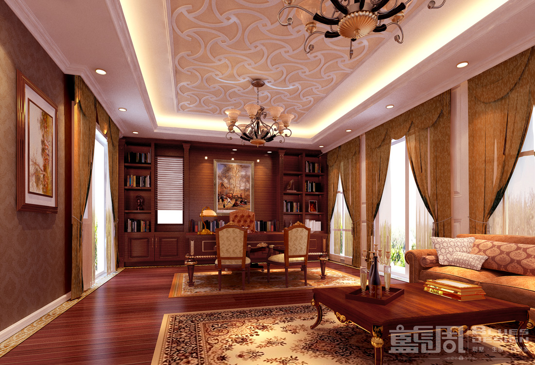 本案擁有近千平方米的闊綽空間,私家花園、游泳池,具備世界頂級豪宅基礎(chǔ)素質(zhì)。業(yè)主游歷歐洲,深諳歐洲裝飾風(fēng)格,具有引領(lǐng)潮流的全球化文化視野,這些特質(zhì)決定了別墅裝修的文化定位和價值取向。本案業(yè)主的世界級富豪生活品質(zhì)盡顯無遺。這里收藏的也許不是珠寶和財(cái)富,珍藏的也許是主人的記憶和人生經(jīng)歷的見證物,她能喚起主人對過往歲月的美好回憶,從而獲取從物質(zhì)到精神的雙重滿足。而超大書架,雖無古色古香,亦無過多現(xiàn)代擺設(shè),滿壁的讀物宣示主人內(nèi)心的寧靜和文化的厚度;現(xiàn)代風(fēng)情油畫、古典歐洲抽象畫……提升了環(huán)境的文化品位。