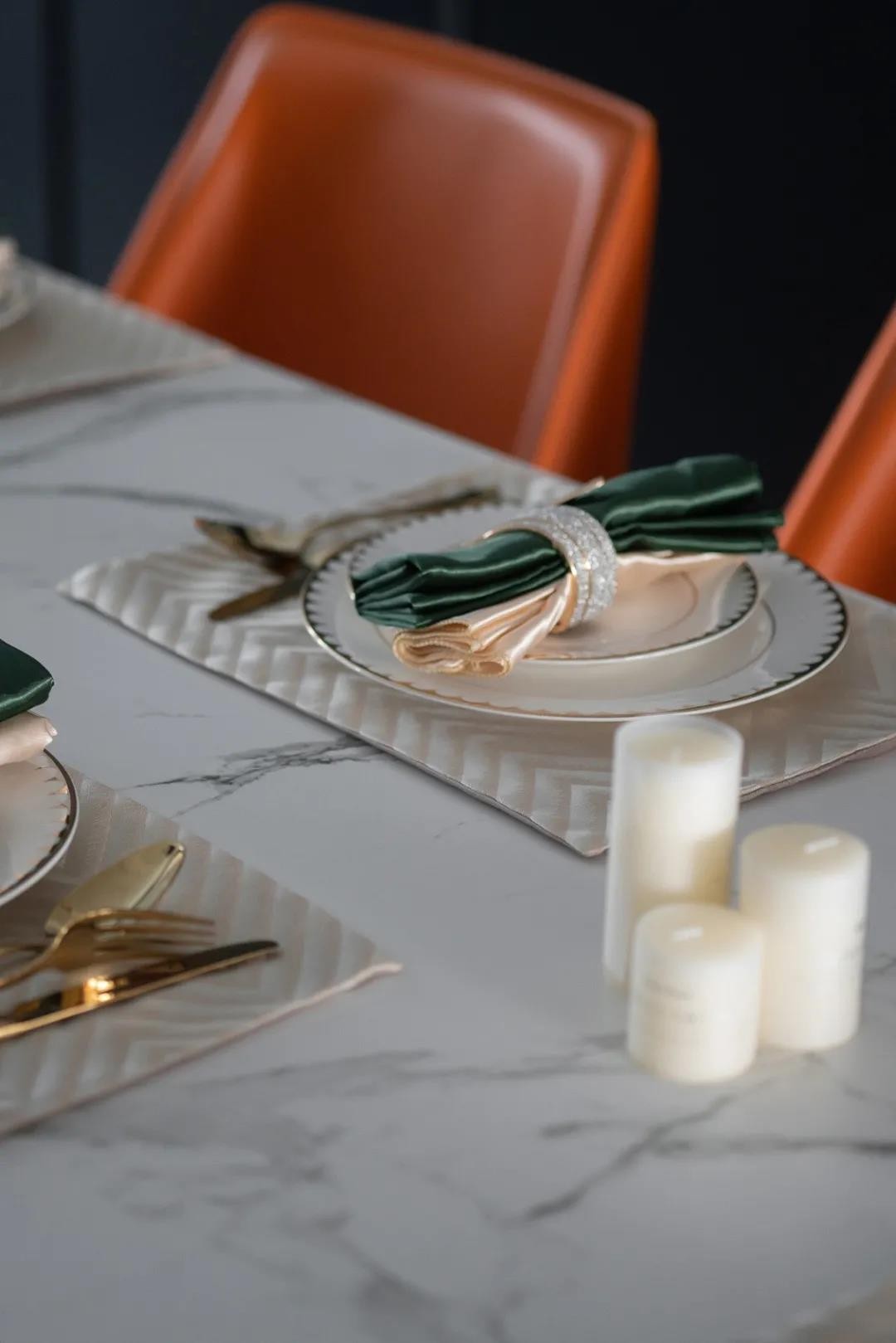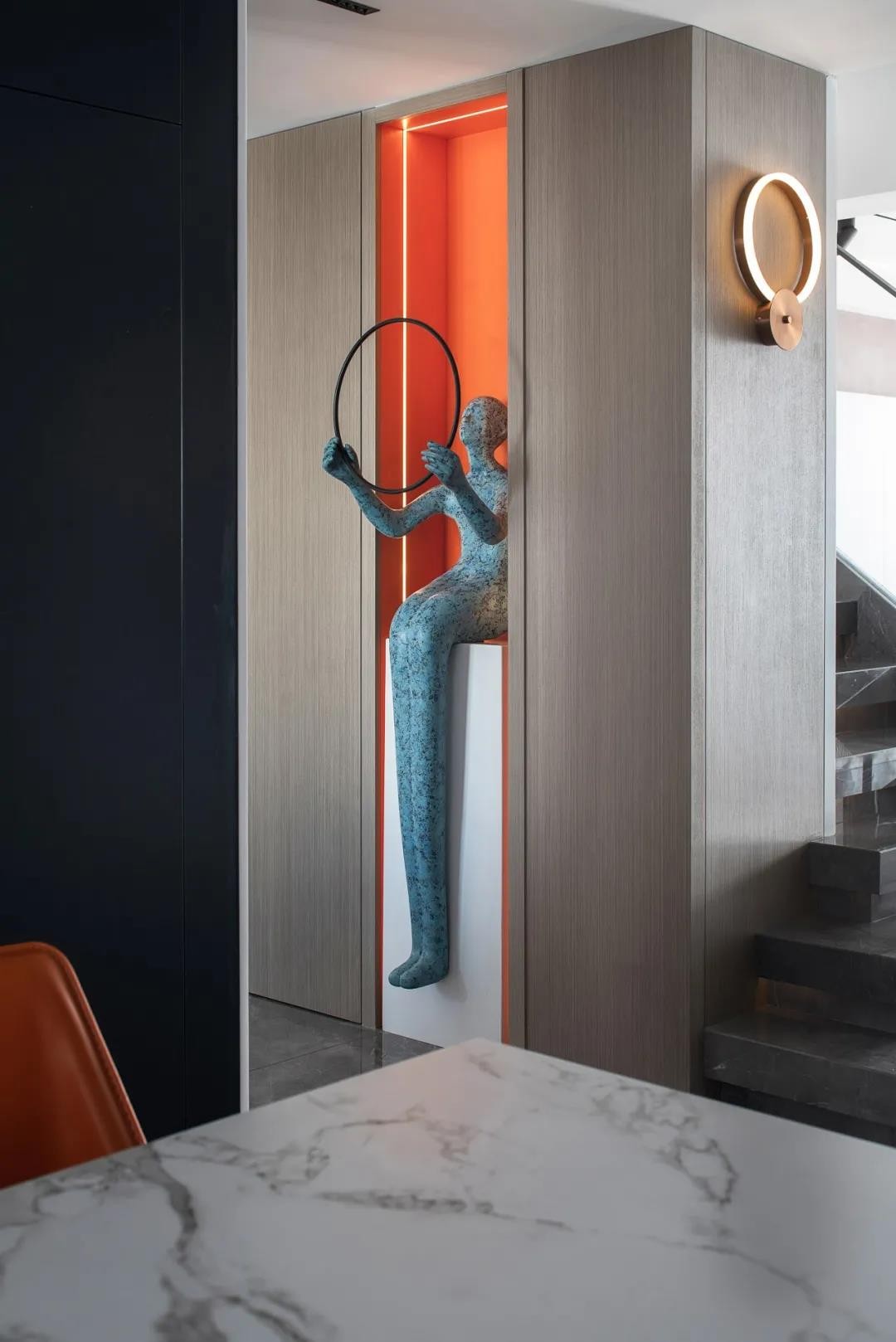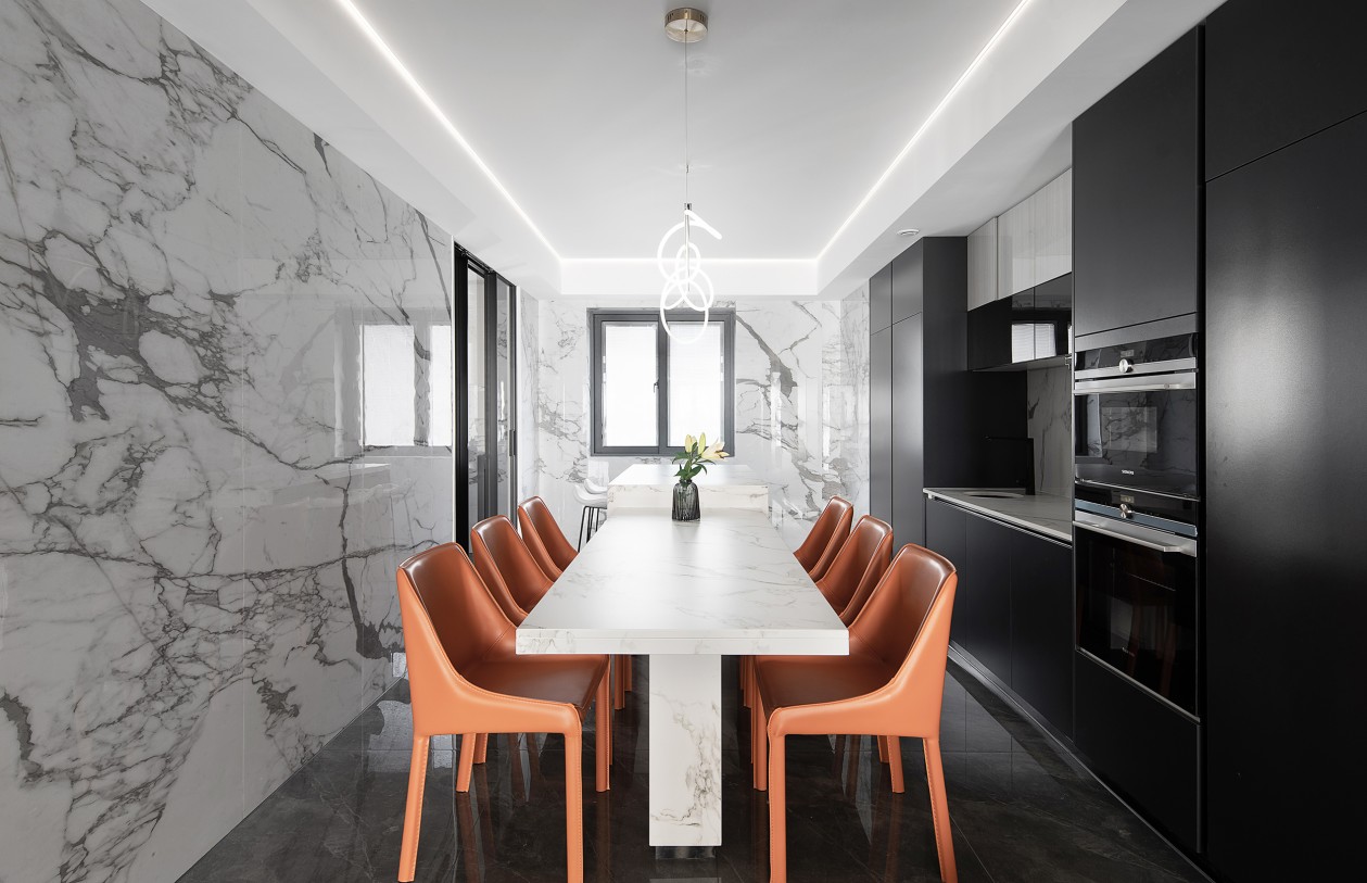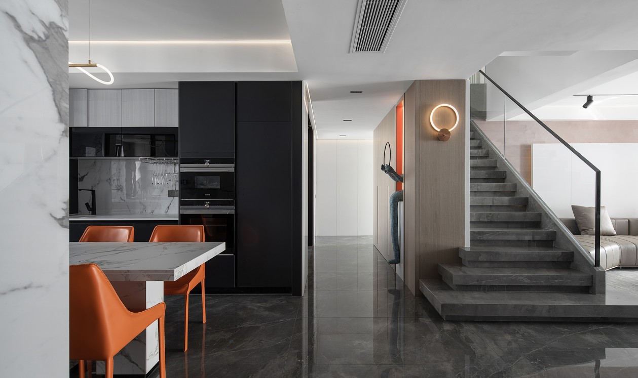 客廳餐廳毗鄰,使得空間通透,視野開闊。餐桌與島臺的高低變化,嵌入式聯(lián)排柜門深邃高雅,細膩鋪敘用餐空間的雅致風(fēng)情。色彩上,愛馬仕橙的皮質(zhì)座椅在黑與白之間跳躍,在經(jīng)典與現(xiàn)代之間,行走在時尚的天秤上,平衡著功能性與時尚美感。