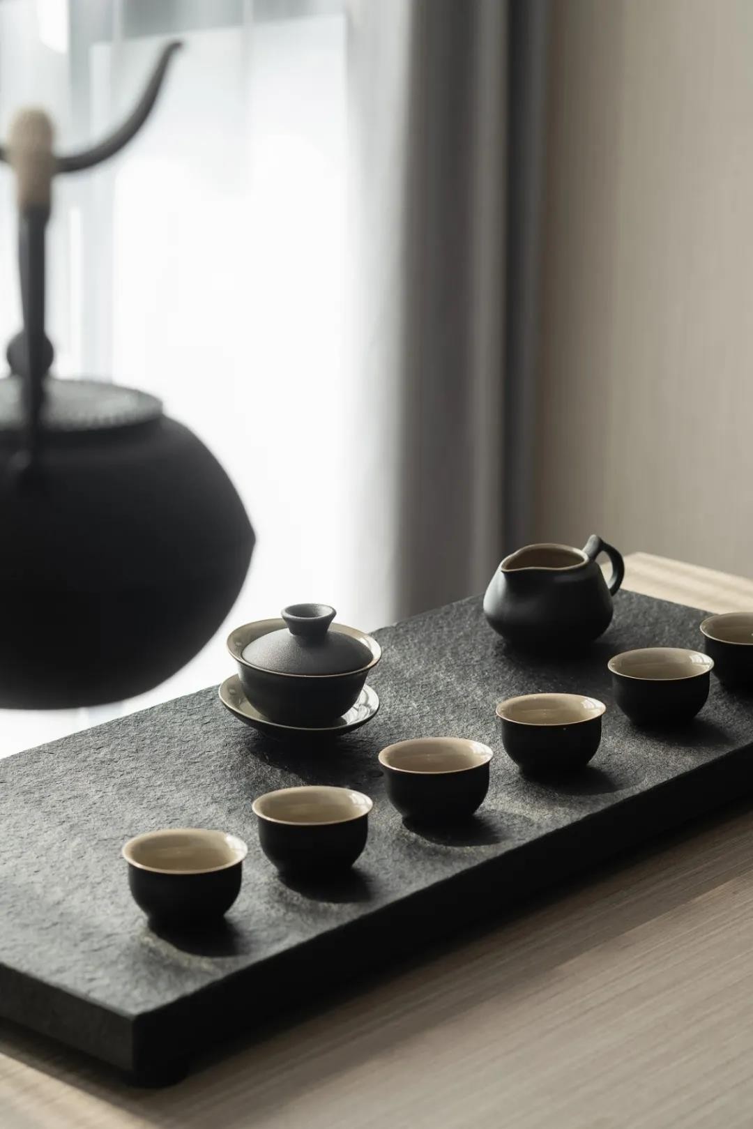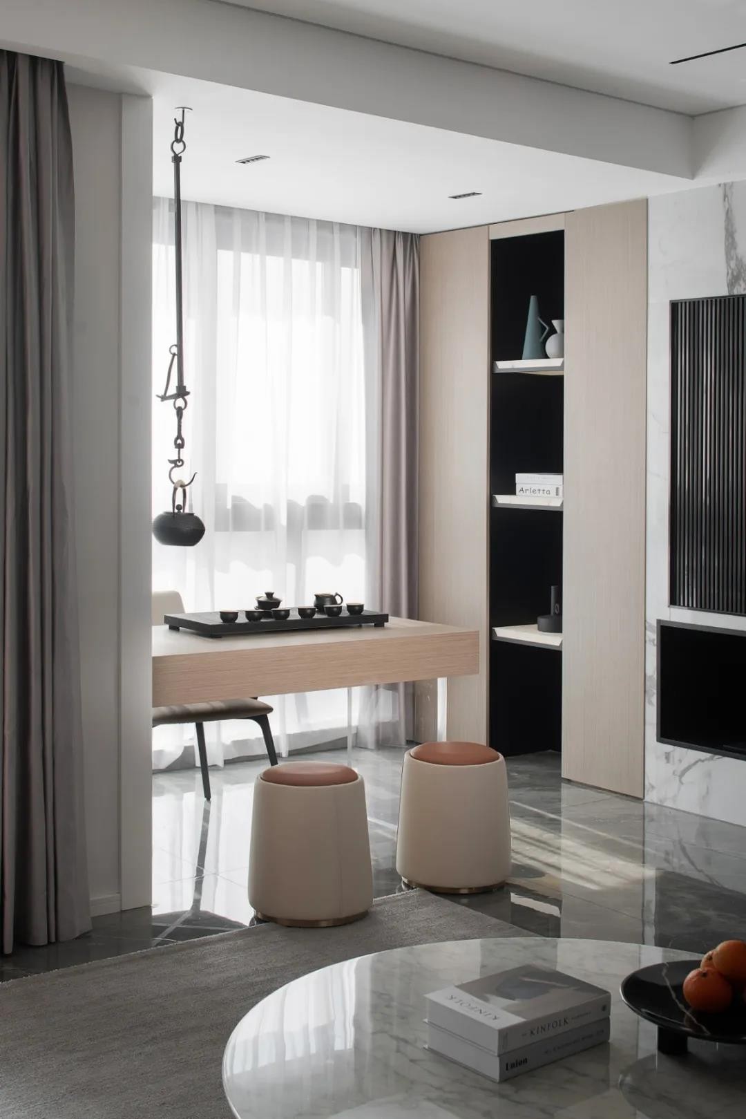 木質(zhì)茶桌的運用,將其從整體空間獨立出來,張弛有度的空間力量,彰顯出當(dāng)代更流行的空間設(shè)計美學(xué),以極簡的設(shè)計,來營造充滿藝術(shù)感的家居氛圍。