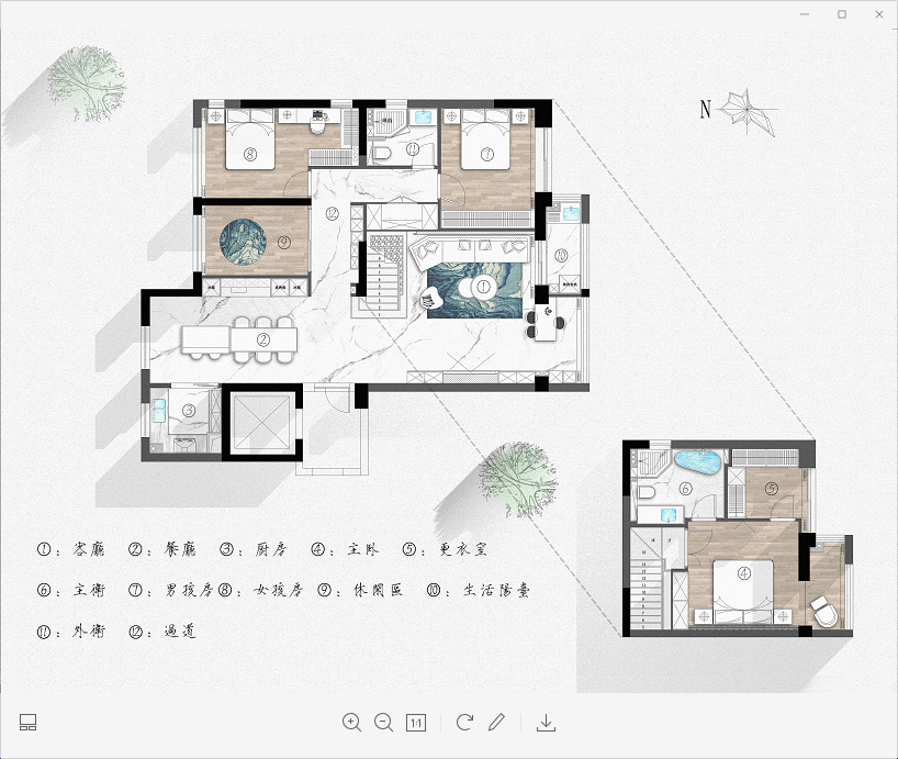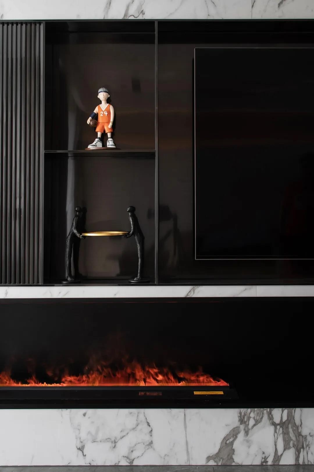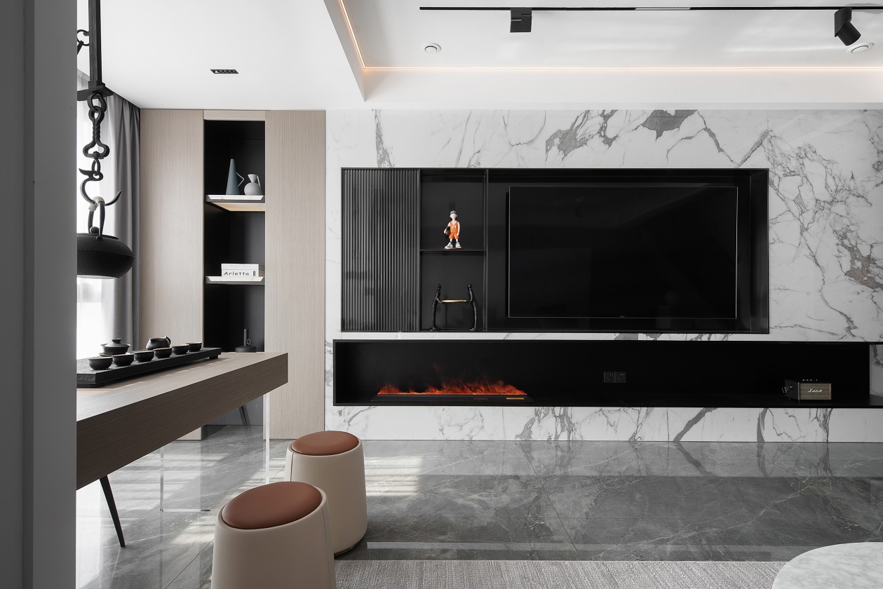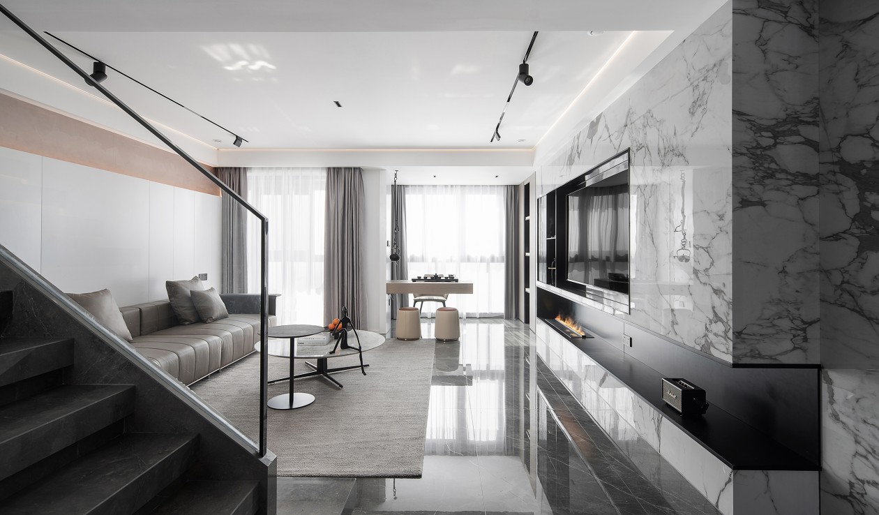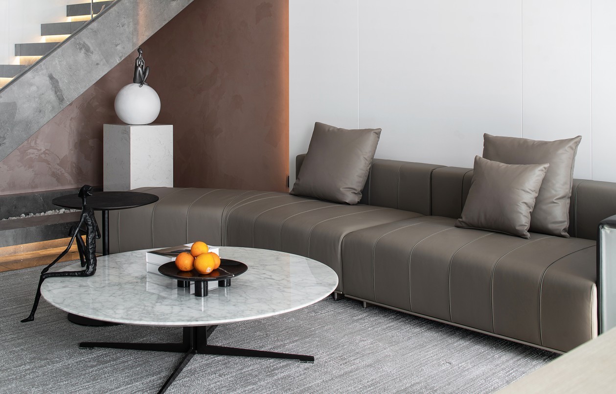黑色的紋理大理石延展到空間的角角落落,奠定了空間沉穩(wěn)內(nèi)斂的底色。淺咖色的皮質(zhì)沙發(fā)與木質(zhì)、柔軟的布藝地毯相互碰撞,讓空間最大程度地提升了空間質(zhì)感和細節(jié)感。白色的邊幾與大理石圓桌布置個性創(chuàng)意的小飾品,也讓空間顯得更加舒適而有趣。