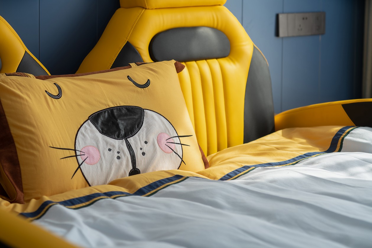 兒子房采用了柔和的黃與淡雅的藍作為點綴,汽車造型的床為空間增加了活力,與柔軟的懶人沙發(fā)相互映照。搭配上充滿童趣的裝飾擺件,趣味十足。陽光穿透紗簾,為房間輸送清晨的第一縷光,旨在營造治愈而優(yōu)雅靈魂居所。