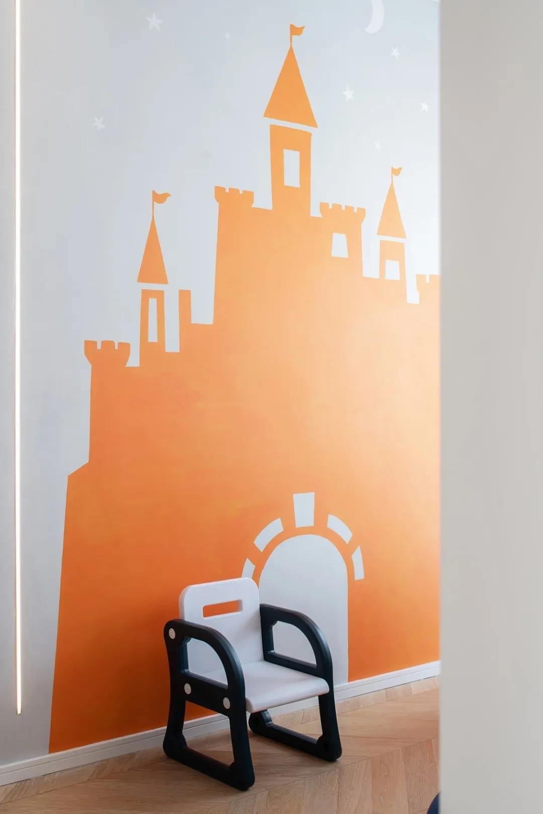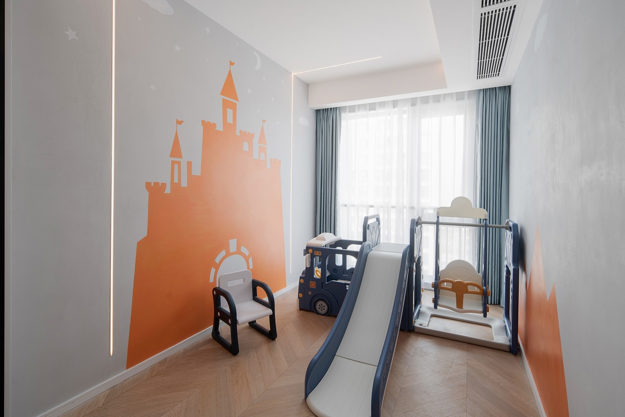 讓家成為港灣,也要成為樂園。橙色的大城堡,藍色的滑滑梯與蕩秋千,讓一方天地,成為孩子的天堂。因家具的可調(diào)整性高,該區(qū)域可隨著孩子的成長改造為書房。