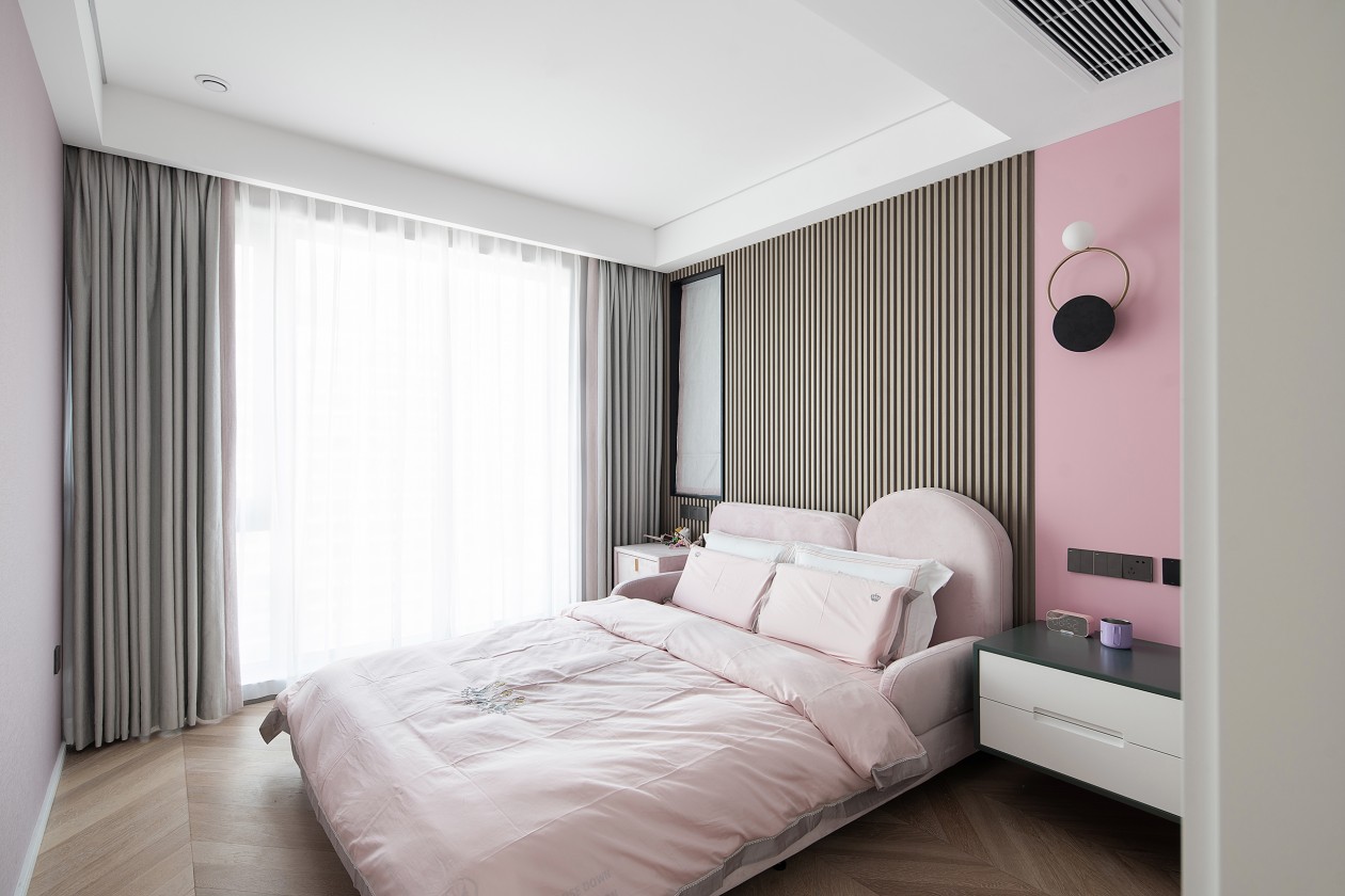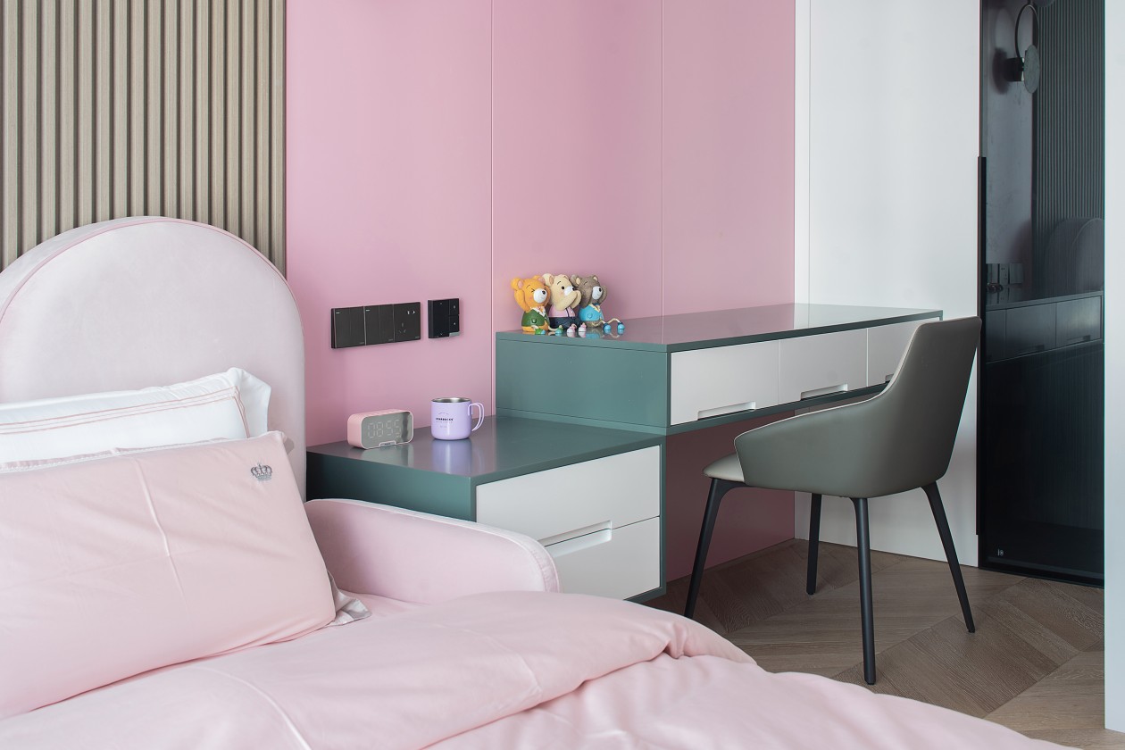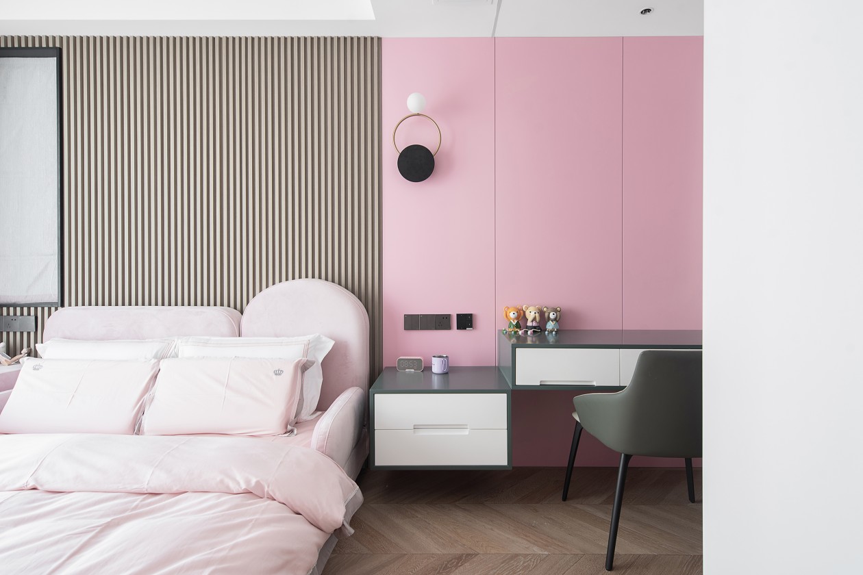 女兒房則選用了灰+白+粉的溫馨搭配,豎條紋理的背景墻融合色彩,粉色的床體與墻體交相呼應(yīng),讓整個空間煥然一新。床頭裝上了金屬圓形小夜燈并配置了獨立小衣帽間,簡約,是細致入微。