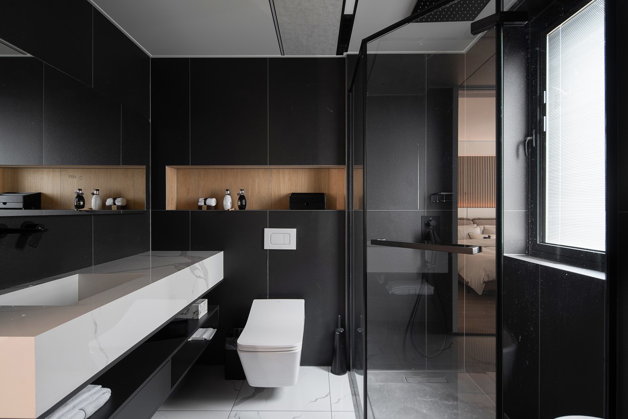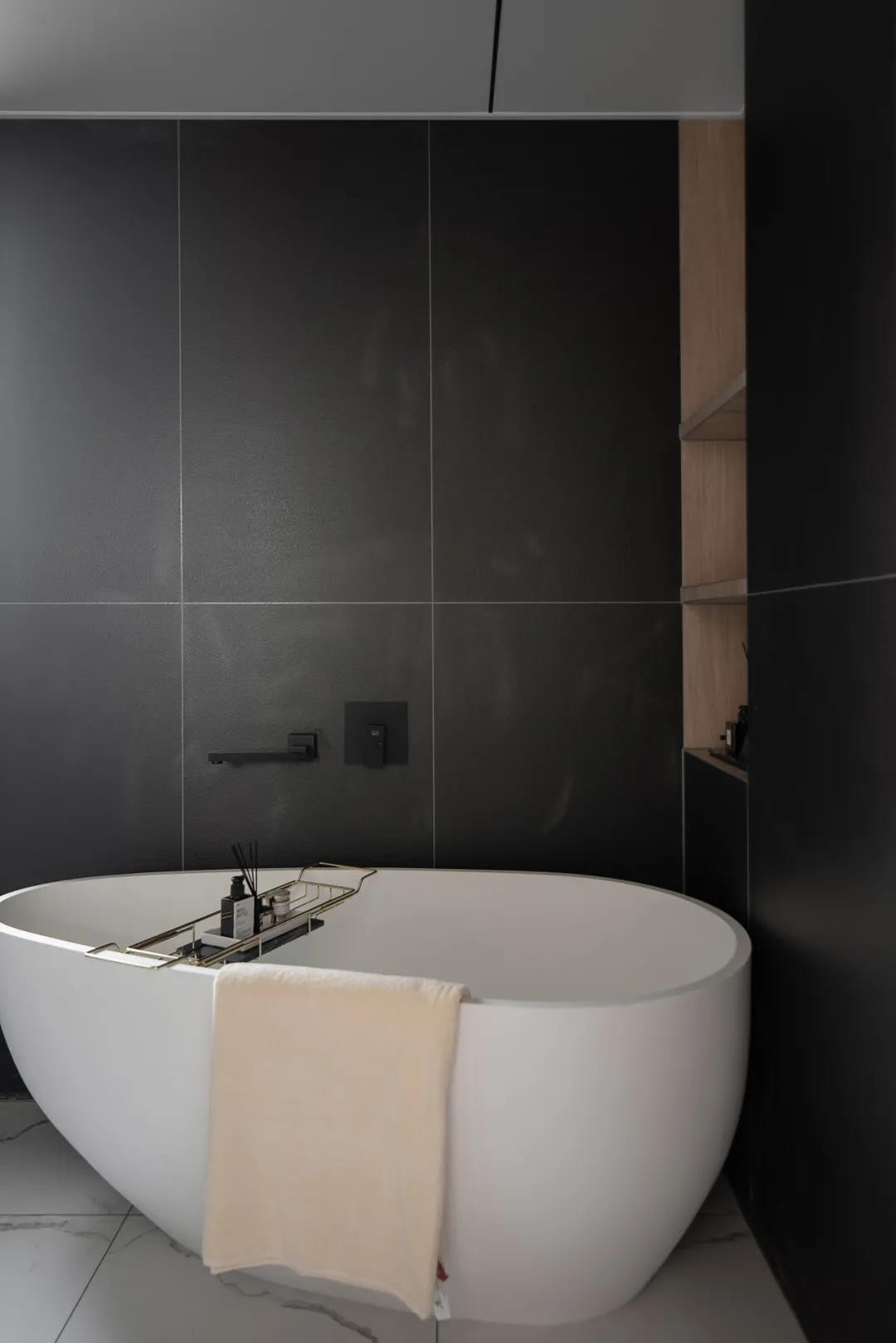 衣帽間選用了白色系木質(zhì)衣櫥與黑橙搭配的透明衣櫥,現(xiàn)代感十足。主臥的獨立衛(wèi)浴則又是另一番天地,以黑色為主調(diào)白色為輔,異形的浴缸將高雅、浪漫演繹到了極致。